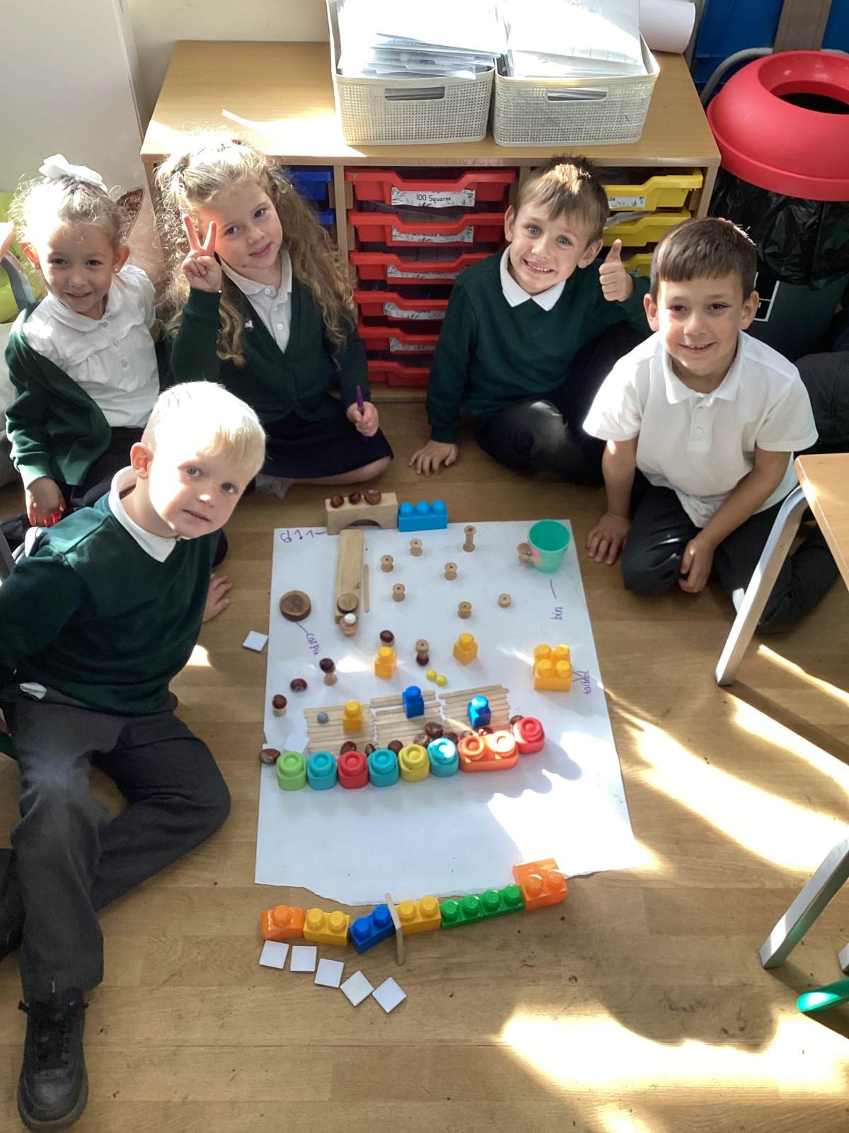 | In Geography we built different types of settlements. These children built a town. | In DT we made windmills and tested them outside in the wind. | In Maths we learnt the symbols less than, greater than and equal to. | We are doing the strong bear pose to make our bodies strong. |